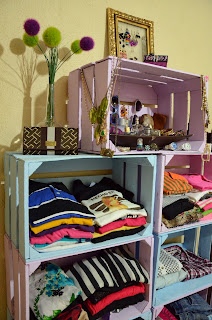 A la mañana siguiente empezamos a armar el "Closet" una caja sobre otra y el resultado fue muy bonito , empezamos a acomodar alguna ropa bien dobladita y en la ultima caja fue ideal para poner los lentes de sol , pulseras , mis perfumes , mis collares , algunos anillos , compre un porta retrato de 8X10 le quite todo y solo deje el puro cuadro , y le puse una mallita con ahujeritos para colgar los aretes , la verdad que quedo super chic :) también use productos reciclados tal como una botella de whisky que había abandonada en la oficina y le puse unas hermosas flores para que le diera un toque romántico , la base donde se encuentran los perfumes es de un arreglo floral que mi mama me mando el día de mi cumpleaños.